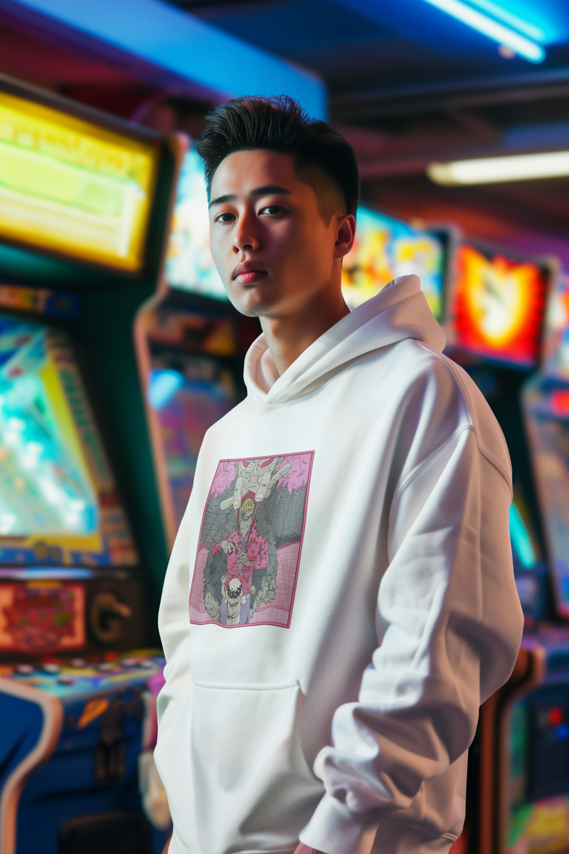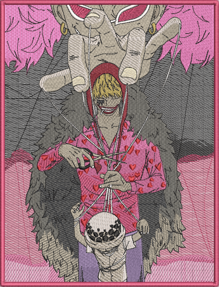 felpa con ricamo dei 3 personaggi della saga di dressrosa (doflamingo, rosinante, law)